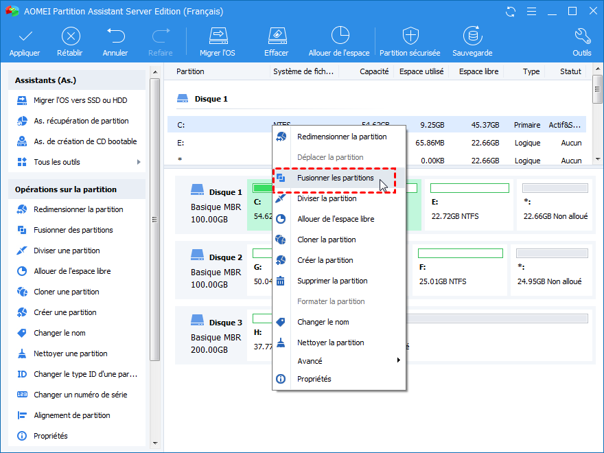 Étape 2 : Faites un clic droit sur le lecteur C et sélectionnez fusionner les partitions.