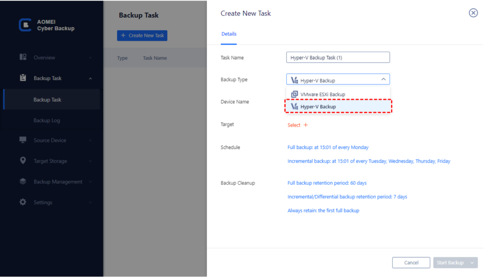 Vous pouvez fournir un nom unique pour cette tâche de sauvegarde ou n’utiliser que le nom du numéro par défaut. Spécifiez ensuite d’effectuer une sauvegarde VMware esxi ou Hyper-V.